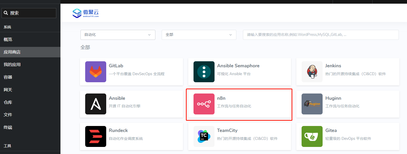 通过 Websoft9 应用商店安装 n8n 应用