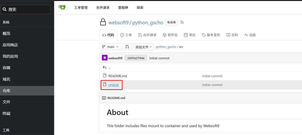 - 程序环境模板运行起来之后,Websoft9 为之创建三个部署核心资源:Git 仓库,容器,网关域名配置项