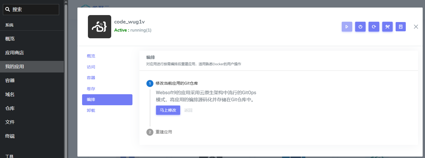 登录 Websoft9 控制台,进入应用的管理界面的 编排 标签页