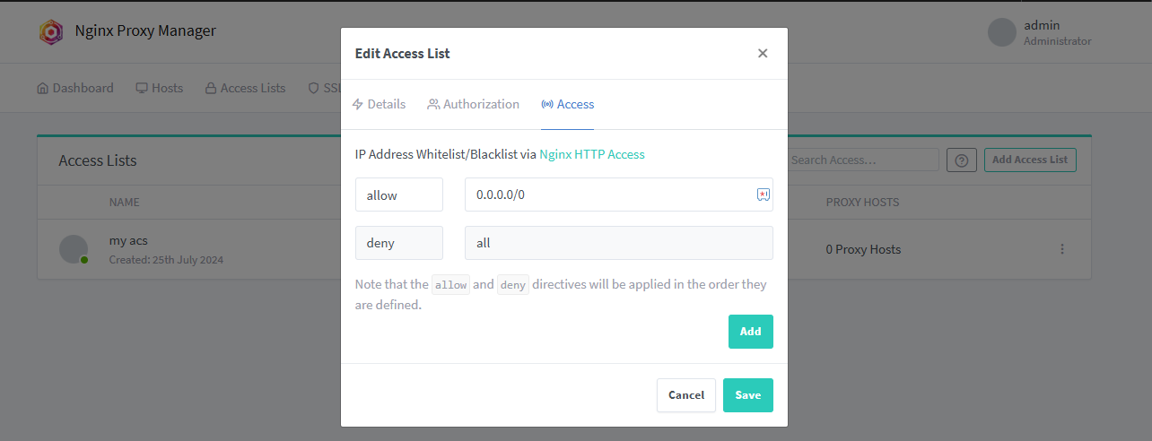 Once you have create access control strategy, you can attach it to your Proxy Host